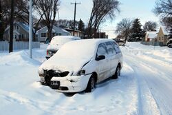 Abandoned vehicle left in deep snow after a joyride in Edmonton, Alberta
