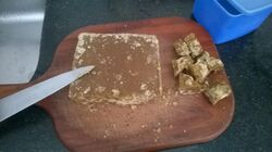 Panela (Spanish pronunciation: [paˈnela]) or rapadura (Portuguese pronunciation: [ʁapaˈduɾɐ]) is an unrefined whole cane sugar, typical of Central and Latin America. It is a solid form of sucrose derived from the boiling and evaporation of sugarcane juice.[1][2] Panela is known by other names in Latin America, such as chancaca in Chile, Bolivia and Peru, piloncillo in Mexico (where "panela" refers to a type of cheese, queso panela). The name piloncillo means little loaf, because of the traditional shape in which this smoky, caramelly and earthy sugar is produced.[3] Just like brown sugar, there are two varieties of piloncillo; one is lighter (blanco) and one darker (oscuro). Unrefined, it is commonly used in Mexico, where it has been around for at least 500 years. Made from crushed sugar cane, the juice is collected, boiled and poured into molds, where it hardens into blocks. Panela is also known as rapadura in Portuguese. Elsewhere in the world, the word jaggery describes a similar foodstuff. Both of them are considered non-centrifugal cane sugars.[1]