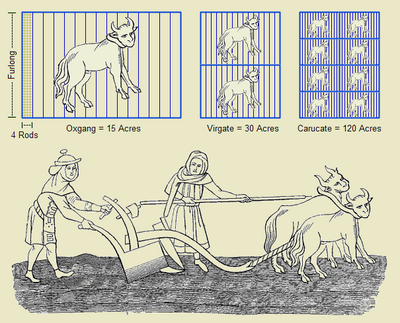 A carucate was the amount of land tillable by a team of eight oxen in a ploughing season. This was equal to 8 oxgangs or 4 virgates.