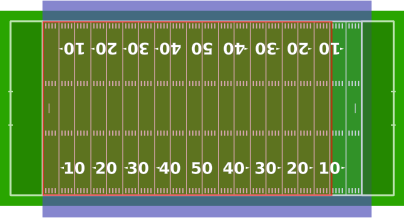 The area of one acre (red) superposed on an American football field (green) and Association football/soccer pitch (blue).