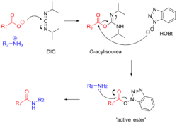 Carbodiimides such as dicyclohexylcarbodiimide (DCC) and diisopropylcarbodiimide (DIC) are frequently used for amide bond formation.[11] The reaction proceeds via the formation of a highly reactive O-acylisourea. This reactive intermediate is attacked by the peptide N-terminal amine, forming a peptide bond. Formation of the O-acylisourea proceeds fastest in non-polar solvents such as dichloromethane.[14]