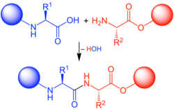 From Handwiki In organic chemistry, peptide synthesis is the production of peptides, compounds where multiple amino acids are linked via amide bonds, also known as peptide bonds. Peptides are chemically synthesized by the condensation reaction of the carboxyl group of one amino acid to the amino group of another. Protecting group strategies are usually necessary to prevent undesirable side reactions with the various amino acid side chains.[1] Chemical peptide synthesis most commonly starts at the carboxyl end of the peptide (C-terminus), and proceeds toward the amino-terminus (N-terminus).[2] Protein biosynthesis (long peptides) in living organisms occurs in the opposite direction.