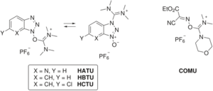 Some coupling reagents omit the carbodiimide completely and incorporate the HOAt/HOBt moiety as an aminium/uronium or phosphonium salt of a non-nucleophilic anion (tetrafluoroborate or hexafluorophosphate).[10] Examples of aminium/uronium reagents include HATU (HOAt), HBTU/TBTU (HOBt) and HCTU (6-ClHOBt). HBTU and TBTU differ only in the choice of anion. Phosphonium reagents include PyBOP (HOBt) and PyAOP (HOAt).[citation needed]