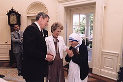— or leaning over someone too weak to stand", according to Moira Donegan.[15] Teresa was photographed with numerous world leaders, also including Yasser Arafat, Edward Kennedy, Indira Gandhi, V. P. Singh, and members of the British Royal Family. Media studies academic Gëzim Alpion wrote a book called Mother Teresa: Saint or Celebrity?, documenting her active fame-seeking.[16] Teresa's relationships with other dubious figures included the Haitian dictators François and Jean-Claude Duvalier and fraudster Charles Keating.[17]