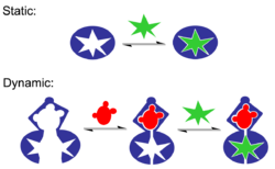 In the case of dynamic molecular recognition the binding of the first guest to the first binding site of a host affects the association constant of a second guest with a second binding site. leading to cooperativity of binding.[22] In the case of positive allosteric systems the binding of the first guest increases the association constant of the second guest. While for negative allosteric systems the binding of the first guest decreases the association constant with the second. The dynamic nature of this type of molecular recognition is particularly important since it provides a mechanism to regulate binding in biological systems.