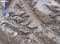 Clay is a common component of sedimentary rock. Shale is formed largely from clay and is the most common of sedimentary rocks.[9] However, most clay deposits are impure. Many naturally occurring deposits include both silts and clay. Clays are distinguished from other fine-grained soils by differences in size and mineralogy. Silts, which are fine-grained soils that do not include clay minerals, tend to have larger particle sizes than clays. There is, however, some overlap in particle size and other physical properties. The distinction between silt and clay varies by discipline. Geologists and soil scientists usually consider the separation to occur at a particle size of 2 μm (clays being finer than silts), sedimentologists often use 4–5 μm, and colloid chemists use 1 μm.[2] Clay-size particles and clay minerals are not the same, despite a degree of overlap in their respective definitions. Geotechnical engineers distinguish between silts and clays based on the plasticity properties of the soil, as measured by the soils' Atterberg limits. ISO 14688 grades clay particles as being smaller than 2 μm and silt particles as being larger. Mixtures of sand, silt and less than 40% clay are called loam.
