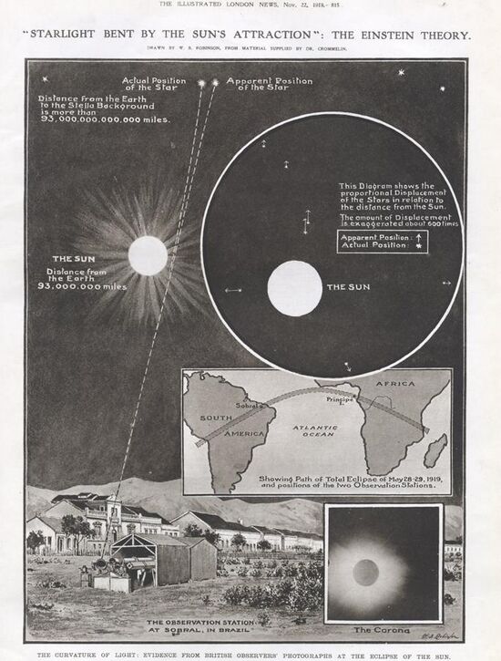 Albert Einstein developed his revolutionary theory of relativity in papers published in 1905 and 1915; these account for the perihelion precession of Mercury.[93] In 1914, Gunnar Nordström attempted to unify gravity and electromagnetism in his theory of five-dimensional gravitation.[lower-alpha 13] General relativity was proven in 1919, when Arthur Eddington observed gravitational lensing around a solar eclipse, matching Einstein's equations. This resulted in Einstein's theory superseding Newtonian physics.[96] Thereafter, German mathematician Theodor Kaluza promoted the idea of general relativity with a fifth dimension, which in 1921 Swedish physicist Oskar Klein gave a physical interpretation of in a prototypical string theory, a possible model of quantum gravity and potential theory of everything.
