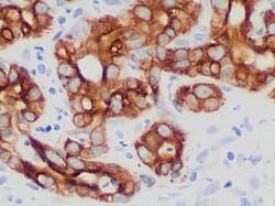 Immunohistochemistry for CK19 in metastatic cholangiocarcinoma to the liver. The positive staining supports the diagnosis, in contrast to a hepatocellular carcinoma which is typically CK19 negative.[64]