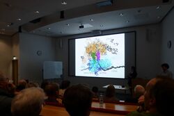 There was no overt hierarchy; everyone was on first-name terms. Most members of the lab met freely in the canteen, which was said to assist inter-divisional communication and collaboration.[6] Today the LMB has around 450 scientists, of whom 130 are postdoctoral researchers and 110 students. The new building (situated on the Cambridge Biomedical Campus) was opened in 2013[4] and has four seminar rooms named after LMB scientists: Sydney Brenner, Aaron Klug, César Milstein and Frederick Sanger, as well as a lecture theatre named after the late Max Perutz.
