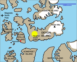 The station is located on Devon Island, a Mars analog environment and polar desert, approximately 165 kilometres (103 mi) north east of the hamlet of Resolute in Nunavut, Canada. The station is situated on Haynes Ridge, overlooking the Haughton impact crater, a 23 km (14 mi) diameter crater formed approximately 39 million years ago (late Eocene).[1] The location is approximately 1,609 km (1,000 mi; 869 nmi) from the Geographic North Pole and approximately 1,287 km (800 mi; 695 nmi) from the Magnetic North Pole.[citation needed]