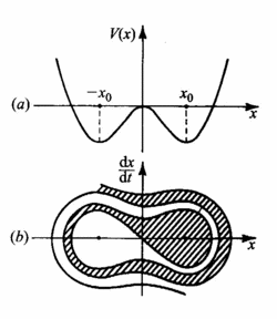 A simple example is that of a point particle moving in a two-well potential with friction, as in Figure 1(a). Due to the friction, all initial conditions, except those at \( x=dx/dt=0 \) or on its stable manifold eventually come to rest at either \( x=x_0 \) or \( x=-x_0 \ ,\) which are the two attractors of the system. A point initially placed on the unstable equilibrium point, \( x=0, \) will stay there forever; and this state has a one-dimensional stable manifold. Figure 1(b) shows the basins of attraction of the two stable equilibrium point, \( x=\pm x_0, \) where the crosshatched region is the basin for the attractor at \( x=x_0 \) and the blank region is the basin for the attractor at \( x=-x_0 \ .\) The boundary separating these two basins is the stable manifold of the unstable equilibrium \( x=0.\)