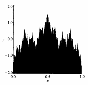In the above example, the basin boundary was a smooth curve. However, other possibilities exist. An example of this occurs for the map \[ x_{n+1}=(3x_n)\mod 1\ ,\] \[ y_{n+1}=1.5y_n + \cos 2\pi x_n\ .\] For almost any initial condition (except for those precisely on the boundary between the basins of attraction), \( \lim _{n\rightarrow \infty} y_n \) is either \( y=+\infty \) or \( y=-\infty \ ,\) which we may regard as the two attractors of the system. Figure 2 shows the basin structure for this map, with the basin for the \( y=-\infty \) attractor black and the basin of the \( y=+\infty \) attractor blank. In contrast to the previous example, the basin boundary is no longer a smooth curve. In fact, it is a fractal curve with a box-counting dimension 1.62.... We emphasize that, although fractal, this basin boundary is still a simple curve (it can be written as a continuous parametric functional relationship \( x=x(s), y=y(s) \) for \( 1>s>0 \) such that \( (x(s_1), y(s_1))\neq (x(s_2), y(s_2)) \) if \( s_1\neq s_2\ .\))