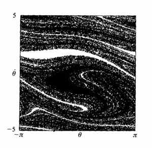 Another example of a system with a fractal basin boundary is the forced damped pendulum equation, \[d^2\theta /dt^2+0.1 d\theta /dt+\sin \theta =2.1 \cos t\ .\] For these parameters, there are two attractors which are both periodic orbits (Grebogi, Ott and Yorke, 1987). Figure 3 shows the basins of attraction of these two attractors with initial \(\theta\) values plotted horizontally and initial values of \(d\theta /dt\) plotted vertically. The figure was made by initializing many initial conditions on a fine rectangular grid. Each initial condition was then integrated forward to see which attractor its orbit approached. If the orbit approached a particular one of the two attractors, a black dot was plotted on the grid. If it approached the other attractor, no dot was plotted. The dots are dense enough that they fill in a solid black region except near the basin boundary. The speckled appearance of much of this figure is a consequence of the intricate, finescaled structure of the basin boundary. In this case the basin boundary is again a fractal set (its box-counting dimension is about 1.8), but its topology is more complicated than that of the basin boundary of Figure 2 in that the Figure 3 basin boundary is not a simple curve. In both of the above examples in which fractal basin boundaries occur, the fractality is a result of chaotic motion (see transient chaos) of orbits on the boundary, and this is generally the case for fractal basin boundaries (McDonald et al., 1985).