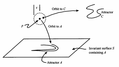 We are now ready to say what we mean by a riddled basin. Suppose our system has two attractors which we denote \(A\) and \(C\) with basins \( \hat A \) and \( \hat C \ .\) We say that the basin \( \hat A \) is riddled, if, for every point \(p\) in \( \hat A \ ,\) an \( \epsilon \)-radius ball, \( B_\epsilon (p)\) centered at \( p \) contains a positive Lebesgue measure of points in \( \hat C\) for any \( \epsilon >0\ .\) This circumstance has the following surprising implication. Say we initialize a state at \(p\) and find that the resulting orbit goes to \(\hat A\ .\) Now say that we attempt to repeat this experiment. If there is any error in our resetting of the initial condition, we cannot be sure that the orbit will go to \(A\) (rather than \(C\)), and this is the case no matter how small our error is. Put another way, even though the basin \(\hat A\) has positive Lebesgue measure (non-zero volume), the set \(\hat A\) and its boundary set are the same. Thus the existence of riddled basins calls into question the repeatability of experiments in such situations. Figure 4 illustrates the situation we have been discussing. As shown in Figure 4, the attractor with a riddled basin lies on a smooth invariant surface (or manifold) \(S\ ,\) and this is general for attractors with riddled basins. Typical systems do not admit smooth invariant manifolds, and this is why riddled basins (fortunately?) do not occur in generic cases. Examples, where a dynamical system has a smooth invariant surface are a system with reflection symmetry of some coordinate \(x\) about \(x=0\ ,\) in which case \(x=0\) would be an invariant manifold, and a predator-prey model in population dynamics, in which case one of the populations being zero (extinction) is an invariant manifold of the model.