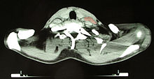 For lymphomas, there are a few different ways radiation oncologists target the cancer cells. Involved site radiation is when the radiation oncologists give radiation only to those parts of the person's body known to have the cancer.[38] Very often, this is combined with chemotherapy. Radiation therapy directed above the diaphragm to the neck, chest or underarms is called mantle field radiation. Radiation to below the diaphragm to the abdomen, spleen or pelvis is called inverted-Y field radiation. Total nodal irradiation is when the therapist gives radiation to all the lymph nodes in the body to destroy cells that may have spread.[39]