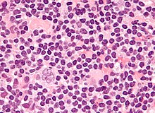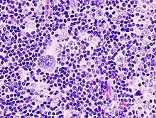 There are two major types of Hodgkin lymphoma: classical Hodgkin lymphoma and nodular lymphocyte-predominant Hodgkin lymphoma.[5] About half of cases of Hodgkin lymphoma are due to Epstein–Barr virus (EBV) and these are generally the classic form.[3][9] Other risk factors include a family history of the condition and having HIV/AIDS.[2][3] Diagnosis is by finding Hodgkin cells such as multinucleated Reed–Sternberg cells (RS cells) in lymph nodes.[2] The virus-positive cases are classified as a form of the Epstein-Barr virus-associated lymphoproliferative diseases.[10]