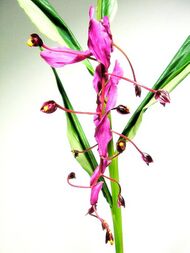 Zingiberaceae (/ˌzɪndʒɪbɪˈreɪsii/) or the ginger family is a family of flowering plants made up of about 50 genera with a total of about 1600 known species[3] of aromatic perennial herbs with creeping horizontal or tuberous rhizomes distributed throughout tropical Africa, Asia, and the Americas. Many of the family's species are important ornamental, spice, or medicinal plants. Ornamental genera include the shell gingers (Alpinia), Siam or summer tulip (Curcuma alismatifolia), Globba, ginger lily (Hedychium), Kaempferia, torch-ginger Etlingera elatior, Renealmia, and ginger (Zingiber). Spices include ginger (Zingiber), galangal or Thai ginger (Alpinia galanga and others), melegueta pepper (Aframomum melegueta), myoga (Zingiber mioga), korarima (Aframomum corrorima), turmeric (Curcuma), and cardamom (Amomum, Elettaria).[4]