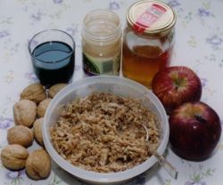 In the Song of Songs the Jewish people are compared to apples, pomegranates, figs, dates, walnuts and almonds, which have all been used as ingredients for Charoset. The Talmud also says that the Charoset should be made "tangy" by using apples to commemorate the apple trees under which the Jewish women secretly gave birth in Egypt (Song of Songs 8:5)[2] The feminine imagery is also alluded to by many rabbinical scholars who believe that Charoset represents the Jewish women's and God's way of relating to slavery and the slaves: "the enslavement was bitter, both physically brutal and psychologically degrading, but the Jewish women didn't lose hope, and God was with [them], raising a new generation of Jewish children."[3] The Maror (enslavement) is tempered with the Charoset (hope and caring).