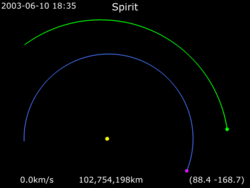 Spirit, also known as MER-A (Mars Exploration Rover – A) or MER-2, is a Mars robotic rover, active from 2004 to 2010.[3] Spirit was operational on Mars for 2208 sols or 3.3 Martian years (2269 days; 6 years, 77 days). It was one of two rovers of NASA's Mars Exploration Rover Mission managed by the Jet Propulsion Laboratory (JPL). Spirit landed successfully within the impact crater Gusev on Mars at 04:35 Ground UTC on January 4, 2004, three weeks before its twin, Opportunity (MER-B), which landed on the other side of the planet. Its name was chosen through a NASA-sponsored student essay competition. The rover got stuck in a "sand trap" in late 2009 at an angle that hampered recharging of its batteries; its last communication with Earth was on March 22, 2010.