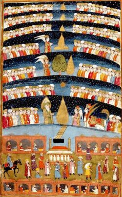 Similar to Jewish traditions such as the Talmud, the Qur'an and Hadith frequently mention the existence of seven samāwāt (سماوات), the plural of samāʾ (سماء), meaning 'heaven, sky, celestial sphere', and cognate with Hebrew shamāyim (שמים). Some of the verses in the Qur'an mentioning the samaawat [60] are Quran 41:12, Quran 65:12, Quran 71:15. Sidrat al-Muntaha, a large enigmatic Lote tree, marks the end of the seventh heaven and the utmost extremity for all of God's creatures and heavenly knowledge.[61]