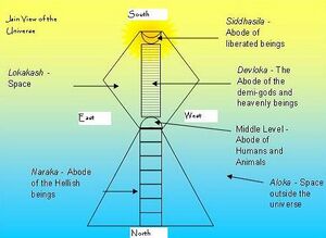 The shape of the Universe as described in Jainism is shown alongside. Unlike the current convention of using North direction as the top of map, this uses South as the top. The shape is similar to a part of human form standing upright.