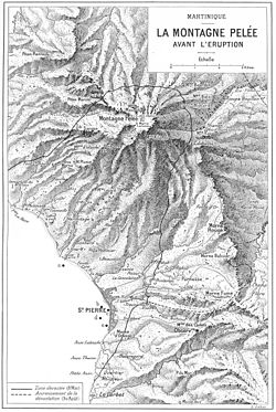 The 1902 eruption of Mount Pelée was a volcanic eruption on the island of Martinique in the Lesser Antilles Volcanic Arc of the eastern Caribbean, which was one of the deadliest eruptions in recorded history. Eruptive activity began on 23 April as a series of phreatic eruptions from the summit of Mount Pelée. Within days, the vigor of these eruptions exceeded anything witnessed since the island was settled by Europeans. The intensity then subsided for a few days until early May, when the phreatic eruptions increased again. Lightning laced the eruption clouds and trade winds dumped ash on villages to the west. Heavy ash fell, sometimes causing total darkness. Some of the afflicted residents panicked and headed for the perceived safety of larger settlements, especially Saint-Pierre, about 10 km (6.2 mi) south of Pelée's summit. Saint-Pierre received its first ash fall on 3 May.[3]