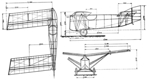 Louis Peyret, who had unsuccessfully attempted to fly the Blériot III floatplane and had designed the Blériot VI, a tandem wing aircraft, was a friend of Louis Blériot.[1] His post-World War I glider was a true tandem wing aircraft with two identical pairs of straight edged, constant chord high mounted wings, swept at 5°. Both also had 5° of dihedral but the front wing was mounted at a larger angle of incidence than the rear for longitudinal stability, as is the tailplane in a conventional aircraft. The wings were built up around tubular Duraluminum spars and braced with N shaped lift struts, also Duraluminum but with wooden fairings, which ran from the lower fuselage longerons to mid-span.[2]