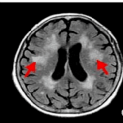 Fluid-attenuated inversion-recovery (FLAIR) image from individual with demyelinating disease (arrow indicates lesion)