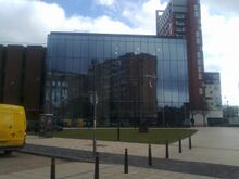 The main building with water sculpture Tipping Triangles by Angela Conner. The building is one of Europe's largest freestanding brick buildings.[18]