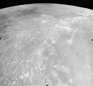 View of the limb of the Moon showing Montes Apenninus (left), Montes Caucasus (right), eastern Mare Imbrium (top), and western Mare Serenitatis (bottom), from Apollo 11. The large crater at the top center is Archimedes.