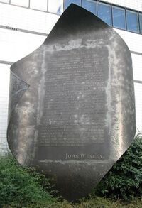A few weeks later, Wesley preached a sermon on the doctrine of personal salvation by faith,[36] which was followed by another, on God's grace "free in all, and free for all."[37] Considered a pivotal moment, Daniel L. Burnett writes: "The significance of Wesley's Aldersgate Experience is monumental ... Without it, the names of Wesley and Methodism would likely be nothing more than obscure footnotes in the pages of church history."[38] Burnett describes this event as Wesley's "Evangelical Conversion".[39] 24 May is commemorated in Methodist churches as Aldersgate Day.[40]