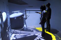 To create a feeling of immersion, special output devices are needed to display virtual worlds. Well-known formats include head-mounted displays or the CAVE. In order to convey a spatial impression, two images are generated and displayed from different perspectives (stereo projection). There are different technologies available to bring the respective image to the right eye. A distinction is made between active (e.g. shutter glasses) and passive technologies (e.g. polarizing filters or Infitec).[70]