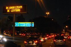 In April 2012, one of the committees of the São Paulo city council approved a bill to introduce a R$4 (~ US$2) per day congestion charge within the same area as the existing road space rationing (Portuguese: Rodízio veicular) by the last digit of the license plate, which has been in force since 1996. The bill still needs approval by two other committees before going for a final vote at the city council.[118][119] Opinion surveys have shown that the initiative is highly unpopular. A survey by Veja magazine found that 80% of drivers are against congestion pricing, and another survey by Exame magazine found that only 1% of São Paulo's residents support the initiative, while 30% find that extending the metro system is a better solution to reduce traffic congestion.[120][121] São Paulo's strategic urban development plan "SP 2040", approved in November 2012, proposes the implementation of congestion pricing by 2025, when the density of metro and bus corridors is expected to reach 1.25 km/km2. The Plan also requires ample consultation and even a referendum before beginning implementation.[122]
