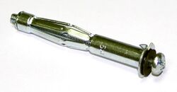 A molly or molly bolt (often misspelled moly[1]) is a type of screw fastener that fastens objects to plaster or gypsum board hollow walls by providing an anchor to be lodged inside a hole and expanded once in position. Larger sizes permit reasonably heavy objects, such as shelving, flatscreen-TV mounts or central-heating radiators, to be attached to drywall in locations where there is no stud behind the drywall. For heavy objects, multiple molly bolts may be required.