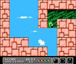 The international version was imported by Bergsala AB into Scandinavian countries in small amounts and was retitled Mr. Gimmick.[1][12] It was released on 19 May 1993.[13] Unlike its Japanese counterpart, this version featured eight lives instead of four. The version also contained downgraded music due to the lack of an expanded sound channel chip. Since the European cartridge is encoded for PAL regions, the game would not work properly on a North American NTSC NES due to graphical glitches, but an identical NTSC prototype ROM has been leaked online which functions properly.[1]