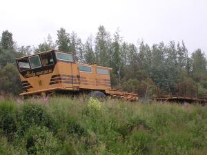 LeTourneau had built a series of prototype "land trains" for use in roadless environments, and Alaska Freight Lines contracted the company to build a special model for cold-climate transportation on January 5, 1955. The contract called for an off-road vehicle capable of transporting 150 short tons (140,000 kg) of cargo in −68 °F (−56 °C) temperatures, through 4-foot (1.2 m) deep streams, and deep snowdrifts.[1]