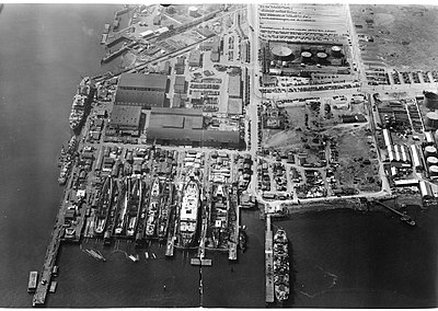 Following the enactment of the Two-Ocean Navy Act, Seattle-Tacoma was awarded contracts to build 25 destroyers.[9] The government invested $9 million in a new destroyer construction facility on Harbor Island which was then built starting October 15, 1940[10] next to the existing repair dock founded in 1918.