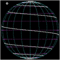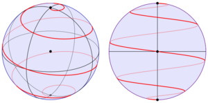 A rhumb line (also known as a loxodrome or "spherical spiral") is the curve on a sphere traced by a ship with constant bearing (e.g., travelling from one pole to the other while keeping a fixed angle with respect to the meridians). The loxodrome has an infinite number of revolutions, with the separation between them decreasing as the curve approaches either of the poles, unlike an Archimedean spiral which maintains uniform line-spacing regardless of radius.