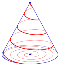 is given, then there can be added a third coordinate [math]\displaystyle{ z(\varphi) }[/math], such that the now space curve lies on the cone with equation [math]\displaystyle{ \;m(x^2+y^2)=(z-z_0)^2\ ,\ m\gt 0\; }[/math]:
