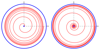 The function [math]\displaystyle{ r(\varphi) }[/math] of a spiral is usually strictly monotonic, continuous and unbounded. For the standard spirals [math]\displaystyle{ r(\varphi) }[/math] is either a power function or an exponential function. If one chooses for [math]\displaystyle{ r(\varphi) }[/math] a bounded function, the spiral is bounded, too. A suitable bounded function is the arctan function: