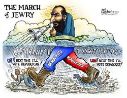 Common to all Evil Jew caricatures is the idea that all Jews act in unison — i.e., they are in a perfect race-based conspiracy and that they are an organized group of people with the same goals and interests in mind. This claim is frankly ridiculous, for multiple reasons. First, it should be obvious that the Jews themselves spread thinly throughout the world — making communication, especially secret communication, very difficult. Second, it should be clear that Jews have not been in positions of power for the vast majority of their history — having long been pushed to the fringes of Muslim and Christian society during the Middle Ages of Europe, it wasn't until the 20th century that Jews started to gain political positions. Third, it should be apparent that Jews are not politically unanimous. For proof, one need only look to the voting patterns of American Jews, who consistently vote Democratic (and thus against unconditional support of Israel in the Middle East). If Jews were of a single racial mind, then surely they would all work towards their common interests — yet they do not. And fourth, Jews are individuals just like everybody. They practice different forms of Judaism, they have different beliefs, agendas, opinions, political affiliations, backgrounds, and occupations. Even when Jews are in the media or in banking, more often than not, they do not frequently overlap with each other or work together as they have separate, unrelated goals.