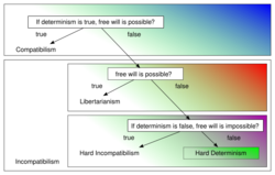 Determinism can be divided into causal, logical and theological determinism.[51] Corresponding to each of these different meanings, there arises a different problem for free will.[52] Hard determinism is the claim that determinism is true, and that it is incompatible with free will, so free will does not exist. Although hard determinism generally refers to nomological determinism (see causal determinism below), it can include all forms of determinism that necessitate the future in its entirety.[53] Relevant forms of determinism include: