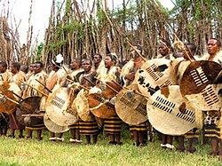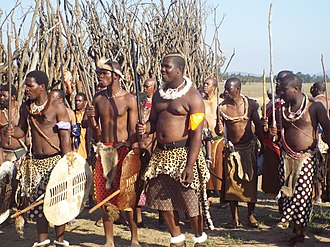 Swazi warriors in traditional garb.