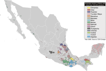 The Spanish arrival in the new world turned the linguistic situation of Mesoamerica upside down. And from then on the indigenous languages have been subject to varying policies imposed on them by the colonial rule. The first impact came from the decimation of the indigenous population by diseases brought by the Europeans. Within the first two centuries of Spanish rule Mesoamerica experienced a dramatic population decline and it is well documented that several small linguistic groups became completely extinct already during the 16th century.[17] The policies that contributed most to a change in the linguistic situation of Mesoamerica were the policies used for conversion of Indians to Christianity. The first victim of this process was the native writing systems which were banned and prohibited and the existing texts destroyed – the pictorial scripts were seen as an idolatry by the Catholic Church. At first missionaries favoured the teaching of Spanish to their prospect converts but from 1555 the first Mexican Council established the policy that the Indians should be converted in their own languages and that parish priests should know the indigenous language of their parishioners. This called for a massive education of clergymen in native languages and the church undertook this task with great zeal. Institutions of learning such as the Colegio de Santa Cruz de Tlatelolco which was inaugurated in 1536 and which taught both indigenous and classical European languages to both Indians and priests were opened. And missionary grammarians undertook the job of writing grammars for the indigenous languages in order to teach priests. For example, the first grammar of Nahuatl, written by Andrés de Olmos, was published in 1547 – three years before the first grammar of French. During this time some literacy in indigenous languages written in the Latin script began to appear. In 1570 Philip II of Spain decreed that Nahuatl should become the official language of the colonies of New Spain in order to facilitate communication between the Spanish and natives of the colonies. Throughout the colonial period grammars of indigenous languages were composed, but strangely the quality of these were highest in the initial period and declined towards the ends of the 18th century.[18] In practice the friars found that learning all the indigenous languages was impossible and they began to focus on Nahuatl. During this period the linguistic situation of Mesoamerica was relatively stable. However, in 1696 Charles II made a counter decree banning the use of any languages other than Spanish throughout the Spanish Empire. And in 1770 a decree with the avowed purpose of eliminating the indigenous languages was put forth by the Royal Cedula.[19] This put an end to the teaching of and writing in indigenous languages and began a strict policy of hispanization of the Indians. However the fact that today around five million people in Mesoamerica still speak indigenous languages suggest that this policy wasn't as effective after all. The most important factor towards the decline of indigenous languages in this period has probably been the social marginalization of the native populations and their languages – and this process has been particularly effective during modern times.