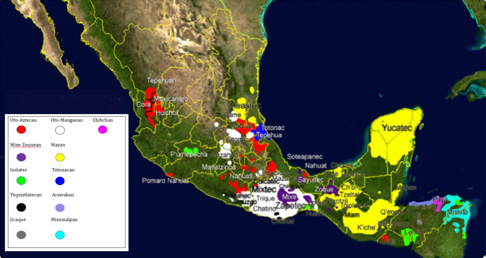 Three large language families are thought to have had their most recent common homelands within Mesoamerica. The time frames and locations in which the common ancestors of these families, referred to by linguists as proto-languages, were spoken are reconstructed by methods of historical linguistics. The three earliest known families of Mesoamerica are the Mixe–Zoquean languages, the Oto-Manguean languages and the Mayan languages. Proto-Oto-Manguean is thought to have been spoken in the Tehuacán valley between 5000 and 3000 BCE,[8] although it may only have been one center of Oto-manguean culture, another possible Oto-Manguean homeland being Oaxaca. Proto-Mayan was spoken in the Cuchumatanes highlands of Guatemala around 3000 BCE.[9] Proto-Mixe–Zoquean was spoken on the gulf coast and on the Isthmus of Tehuantepec and on the Guatemalan Pacific coast around 2000 BCE, in a much larger area than its current extension.[10] Totonacan languages, Purépecha, Huave and the Tequistlatecan languages can also be assumed to have been present in Mesoamerica at this point although it is unknown.