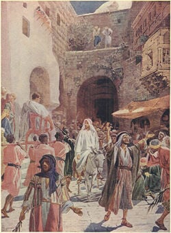 The Gospels state that Jesus then rode the colt (or in Matthew, the colt and its mother) into Jerusalem. As Jesus approached the city, his supporters laid down their cloaks in front of him, and also laid down small branches of trees. The people are also described as singing part of Psalm 118 - ...Blessed is he who comes in the name of the Lord. Blessed is the coming kingdom of our father, David. ... (Psalms 118:25-26).