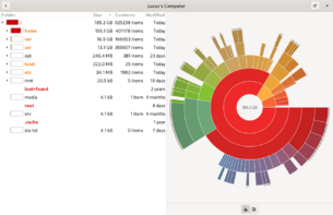 Disk Usage Analyzer is a graphical disk usage analyzer for GNOME. It was part of GNOME Core Applications,[1] but was split off for GNOME 3.4. It was originally named Baobab after the Adansonia tree. The software gives the user a menu-driven, graphical representation of what is on a disk drive.[2] The interface allows for selection of specific parts of filesystem being scanned so a single folder, the entire filesystem, and even remote folders and filesystems can be scanned.[3] The graphical representation can be switched between a ring chart and a treemap chart so the presentation can be tailored to the specific content being scanned.[4]