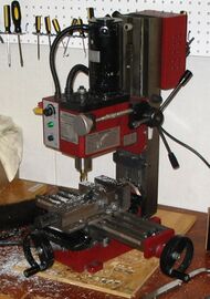 A third type also exists, a lighter, more versatile machine, called a mill-drill. The mill-drill is a close relative of the vertical mill and quite popular in light industry; and with hobbyists. A mill-drill is similar in basic configuration to a very heavy drill press, but equipped with an X-Y table and a much larger column. They also typically use more powerful motors than a comparably sized drill press, most are muti-speed belt driven with some models having a geared head or electronic speed control. They generally have quite heavy-duty spindle bearings to deal with the lateral loading on the spindle that is created by a milling operation. A mill drill also typically raises and lowers the entire head, including motor, often on a dovetailed (sometimes round with rack and pinion) vertical column. A mill drill also has a large quill that is generally locked during milling operations and released to facilitate drilling functions. Other differences that separate a mill-drill from a drill press may be a fine tuning adjustment for the Z-axis, a more precise depth stop, the capability to lock the X, Y or Z axis, and often a system of tilting the head or the entire vertical column and powerhead assembly to allow angled cutting-drilling. Aside from size, the principal difference between these lighter machines and larger vertical mills is that the X-Y table is at a fixed elevation; the Z-axis is controlled by moving the head or quill down toward the X,Y table. A mill drill typically has an internal taper fitting in the quill to take a collet chuck, face mills, or a Jacobs chuck similar to the vertical mill.
