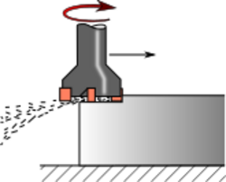 Milling is a cutting process that uses a milling cutter to remove material from the surface of a work piece. The milling cutter is a rotary cutting tool, often with multiple cutting points. As opposed to drilling, where the tool is advanced along its rotation axis, the cutter in milling is usually moved perpendicular to its axis so that cutting occurs on the circumference of the cutter. As the milling cutter enters the work piece, the cutting edges (flutes or teeth) of the tool repeatedly cut into and exit from the material, shaving off chips (swarf) from the work piece with each pass. The cutting action is shear deformation; material is pushed off the work piece in tiny clumps that hang together to a greater or lesser extent (depending on the material) to form chips. This makes metal cutting somewhat different (in its mechanics) from slicing softer materials with a blade.