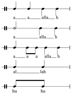 For those who perform it, the haḍra marks the climax of the Sufi's gathering regardless of any teaching or formal structure - it often follows a formal teaching session as a way of internalizing the lessons. Musically, the structure of the haḍra includes several secular Arab genres (each of which expresses a different emotion) and can last for hours.[1] It is directed by the sheikh of the tariqa or one of his representatives; monitoring the intensity, depth and duration of the phases of the haḍra, the sheikh aims to draw the circle into deep awareness of God and away from the participants own individuatedness.